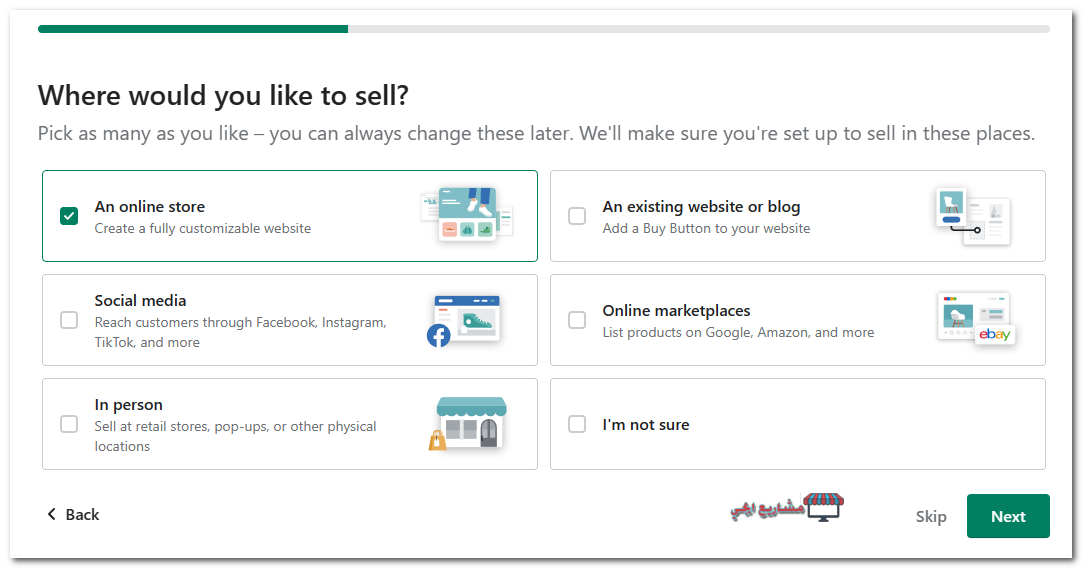 انشاء متجر - تظهر لك بعض الاسئلة يمكنك الاجابة عليها ثم الضغط next وفي حالة عدم الرغبة للاجابة في البداية اضغط skip.